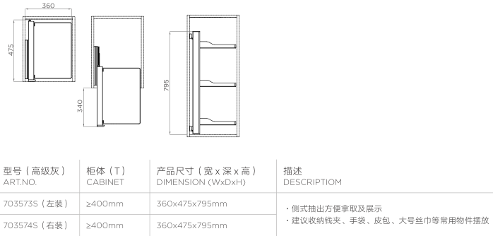 • 侧式抽出方便拿取及展示